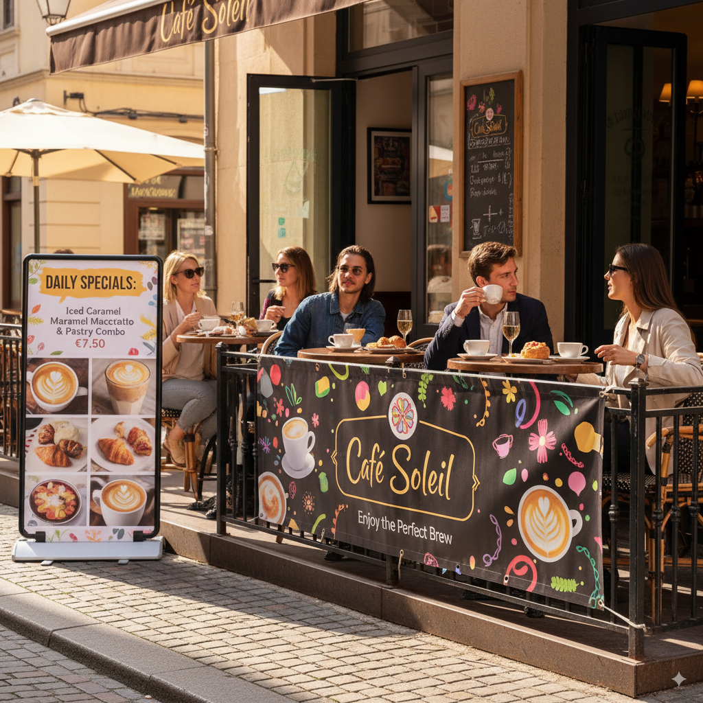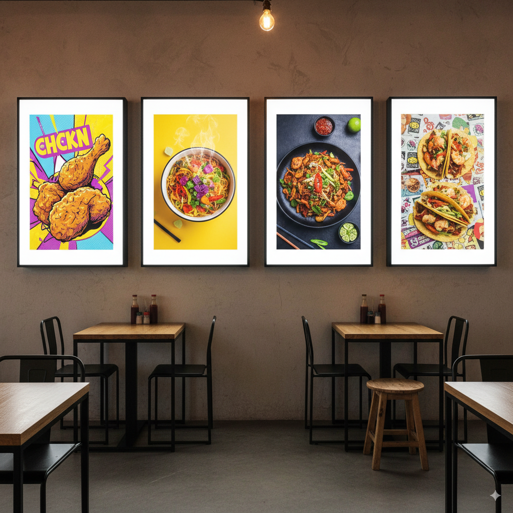 Farbenfrohe Food-Prints und Poster schaffen eine moderne Atmosphäre, setzen Speisen wirkungsvoll in Szene und verleihen jedem Gastraum einen einzigartigen CharakterTextil-Leuchtkästen LED