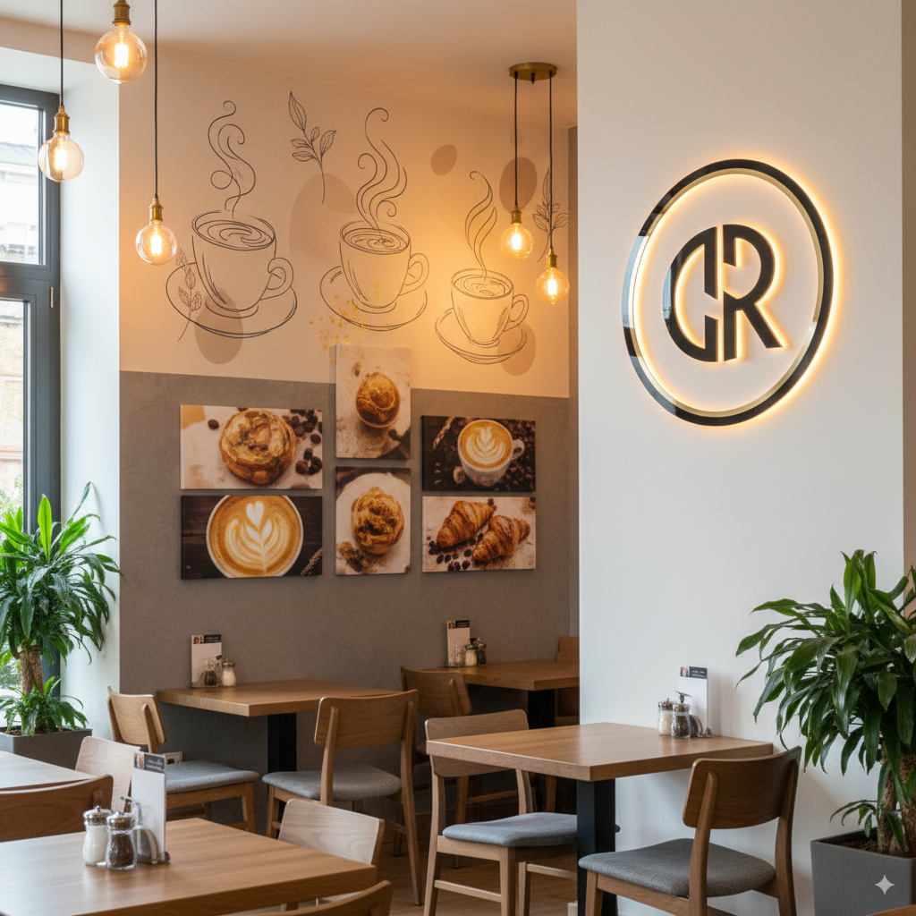 Fototapeten, Leinwandbilder und 3D-Logos aus Acryl verleihen Ihrem Restaurant eine stilvolle Atmosphäre und unterstreichen Ihre MarkenidentitätLeuchtkästen & 3D-Buchstaben
